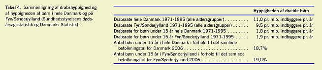 Drab på børn begås overvejende af de biologiske forældre eller stedforældre. Den frygtede ukendte gerningsmand findes kun i ganske få tilfælde. Hart Hansen beskrev i sin undersøgelse af drab i Danmark 1946-1970, at der i løbet af undersøgelsesperioden var sket et kraftigt fald i antallet af familiedrab og i antallet af kvinder, som begik drab. Den hyppigst anvendte drabsmetode blandt kvinder, som begik drab, var kulilteforgiftning fra bygas. En sammenligning af herværende opgørelse og Hart Hansens landsdækkende undersøgelse tyder på, at der er sket et yderligere fald i hyppigheden af familiedrab i de seneste årtier. Sammenligningen må tages med det forbehold, at denne undersøgelse kun omfatter Fyn og Sønderjylland. Der er dog kun ganske små forskelle i drabsraterne og i det relative antal børn for hele landet og for Fyn/Sønderjylland (Tabel 4). I Hart Hansens undersøgelse var den årlige drabsrate blandt kvinder, der begik familiedrab, 1,2 pr. mio. indbyggere og blandt mænd 0,65 pr. mio. indbyggere mod henholdsvis 0,08 pr. mio. indbyggere for kvindelige gerningsmænd og 0,42 pr mio. indbyggere for mandlige gerningsmænd i denne undersøgelse. Der er altså især sket et betydeligt fald i antallet af familiedrab, som begås af kvinder. Årsagen til denne udvikling kan ikke udledes af den herværende undersøgelse, men den er formodentlig, at kvinder generelt har fået bedre sociale vilkår samtidig med, at kvinder nu er berøvet en lettilgængelig og smertefri drabsmetode i form af kulilte fra bygas [1, 2].