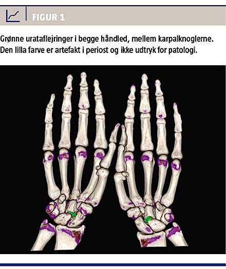 I den videre udredning viste en røntgenundersøgelse af hænder, håndled og forfødder normale forhold. Der var normal reumafaktor, anti-CCP (cyklisk citrullineret peptid-antistof) og negative antinukleære antistoffer. P-uratniveauet ved første besøg var 0,44 mmol/l (referenceinterval: 0,23-0,48). Tre måneder senere var P-uratniveauet 0,63 mmol/l. Efter gentagne lokale steroidinjektioner i håndleddene og flere ledpunkturer med uratnegative mikroskopiundersøgelser blev patienten i maj 2014 henvist til DECT, hvorved der blev påvist urataflejringer i begge håndled (Figur 1). Man påbegyndte behandling med 100 mg allopurinol dagligt med optrapning over to måneder til 300 mg dagligt. I de følgende fem måneder var der ingen nye anfald. Patienten havde ikke væsentlige smerter i leddene og P-uratkoncentrationen var faldet til 0,28 mmol/l.