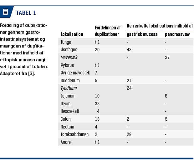 Cysterne kan være lokaliseret i alle dele af det gastrointestinale system [2], men næsten 50% af tilfældene er dog lokaliseret i tyndtarmen. Dernæst er øsofagus og colon de hyppigste lokalisationer (Tabel 1) [3]. Der ses en øget hyppighed hos drenge. Cysterne er karakteriseret ved at indeholde glatmuskulatur i væggene og ved at være beklædt med epitel fra gastrointestinalkanalen, men ikke nødvendigvis fra deres udspringsområde. Således kan man finde ventrikelslimhinde eller pancreasvæv i duplikationscyster lokaliseret i hele gastrointestinalkanalen. Duplikationscyster kan være isoleret fra eller kommunikere med lumen af gastrointestinalkanalen [3] og kan være lokaliseret mesenterielt eller antimesenterielt.