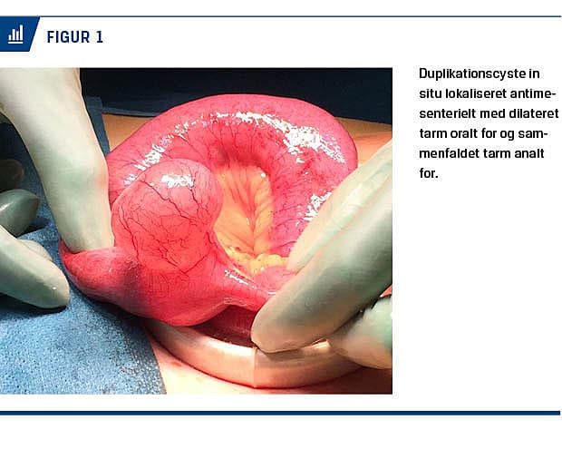 og man havde mistanke om torkveret ovariecyste eller hydrosalpinx. Derfor blev der udført diagnostisk laparoskopi, hvorved genitalia interna og appendix vurderedes normale. Ved gennemgang af tyndtarmene lokaliserede man den cystiske forandring antimesenterielt ca. 40 cm fra ileocækalstedet (Figur 1). Oralt for cysten var tarmen dilateret og analt herfor sammenfaldet. Den cystiske forandring blev receseret gennem en pfannenstiel incision, og der blev udført håndsyet end to end-anastomose. Der blev ikke fundet yderligere intraabdominal patologi. Det postoperative forløb var ukompliceret, og patient blev udskrevet efter få dage.