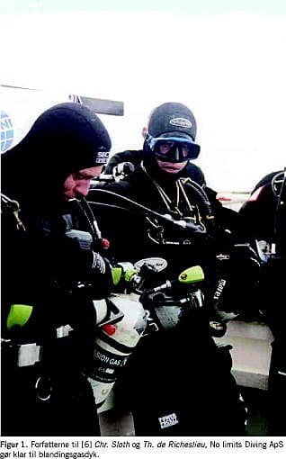 Ved blandingsgasser forstås alle andre åndingsgasblandinger end luft. Formålet med at bruge sådanne blandinger ved dybe dyk er dels at undgå kvælstofnarkose (se ovenfor), dels at undgå toksiske partialtryk af ilt, idet pO2 på ca. 1,7 atm kan udløse cerebral iltforgiftning [4], der i de sværeste tilfælde viser sig som epileptiforme kramper, der naturligvis let kan resultere i drukning. Disse formål tilgodeses ved tilsætning af helium til åndingsgassen, da helium ingen kendt narkotisk effekt har [5]. Da helium yderligere har en lav viskositet og massefylde, er respirationsmodstanden (der stiger med trykket) mindre under ånding af heliox (helium + ilt) eller trimix (helium + ilt + kvælstof [5]) end ved ånding af luft. På mere end 60-80 meters dybde vil pO2 afhængigt af neddykningsgassens sammensætning medføre risiko for iltforgiftning, hvorfor det er nødvendigt at medbringe en særlig »bundgas« med lavt iltindhold [6]. På store dybder kan flere bundgasser blive nødvendige. Ved ånding i åbne systemer øges gasforbruget med dybden, og dekompressionstid og hertil hørende gasmængde øges også. Desuden bør dykkeren medbringe såkaldt bail-out -gas til brug ved opstigning, hvis den primære gasbeholdning svigter. Da helium er meget varmeledende, kan det for at undgå excessiv afkøling yderligere være ønskeligt at medbringe en tung gas til oppustning af dragten! Blandingsgasdykkere kan da også se groteske ud med deres mange flasker og øvrige udstyr (Figur 1 ). Det er klart, at sådan dykning kræver en meget nøje og kompliceret planlægning vedrørende gassernes sammensætning og mængde for at undgå iltforgiftning, hypoksi og kvælstofnarkose under hensyntagen til dybde, varighed, dekompressionskrav og sikkerhedsmargin. Blanding af gasserne og nøje kontrol af deres sammensætning, herunder kalibrering af måleapparatur, hører også til forberedelserne. For kvalificerede dykkere er brug af denne teknik accepteret i British Subaqua Clubs regi ned til 80 m. På større dybder er det nok rimeligt at tale om ekstremsport. Dybderekorden ved sådanne amatørdyk blev nået i 2005 med 330 m. Til dette dyk var det nødvendigt med en dekompression i vandet på over ni timer, og det blev kompliceret på bunden af voldsomme øresmerter (barotraume?) og high pressure nervous syndrome (HPNS) hos dykkeren (se nedenfor). Under dykket åndedes ti forskellige gasblandinger, de fleste trimix [7]. Undervejs mod denne rekord er adskillige tidligere rekordholdere omkommet. Blandingsgasdykning er en aktivitet for velbegavede, ansvarsbevidste, omhyggelige personer med gode matematiske færdigheder og gerne en baggrund som narkoselæge, respirationsfysiolog og eller ingeniør!