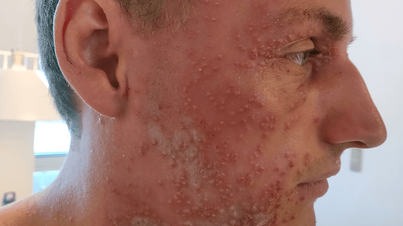 En 23-årig mand med atopisk dermatitis (AD) blev vurderet akut på hudafdeling fem dage efter debut af et udslæt ved venstre mundvig, som siden var spredt til ansigt og hals. Patienten var afebril med smerter fra udslættet og højre øje. Objektivt sås et symmetrisk, vesikuløst udslæt med tætstillede erosioner, gullig sekretion og skorpedannelse på halsen samt rødme af conjunctiva på højre øje.