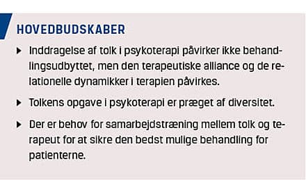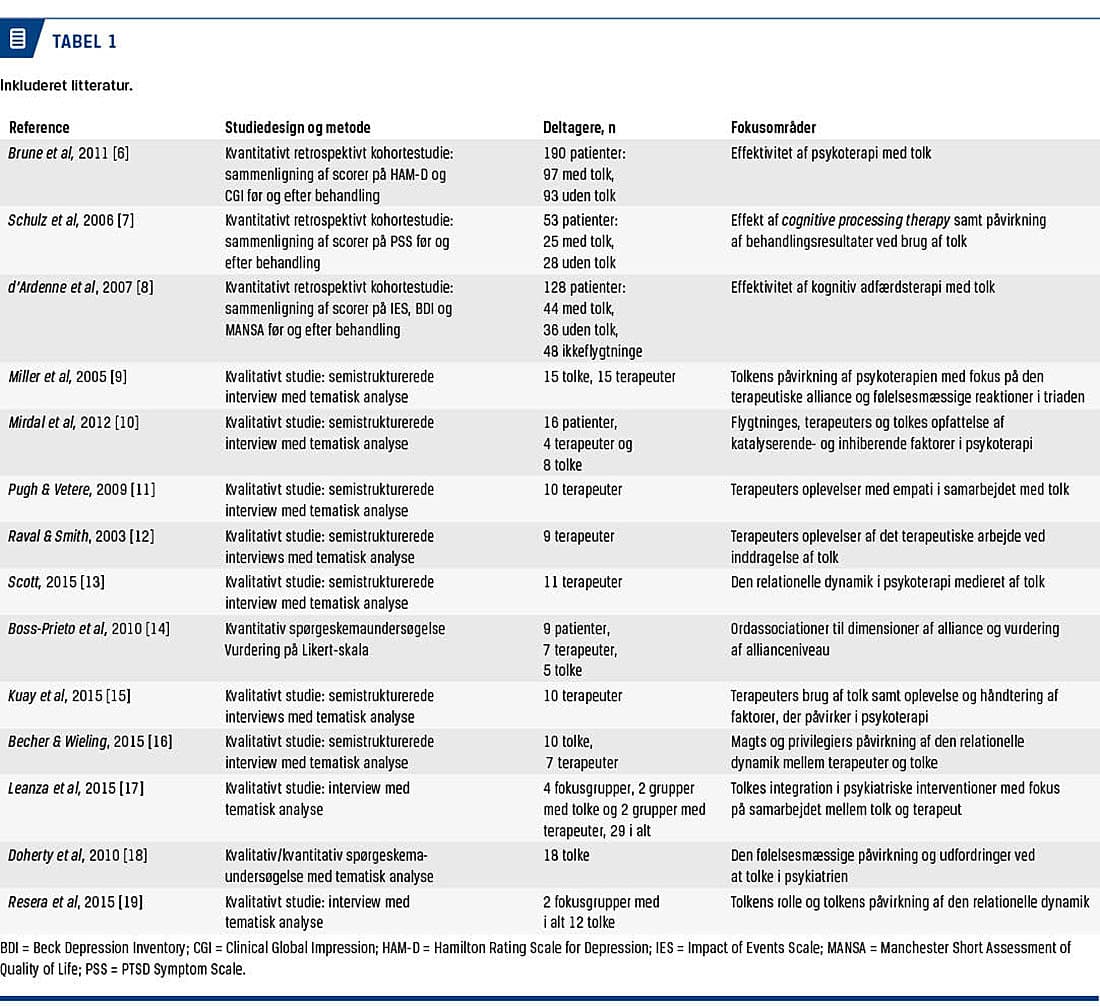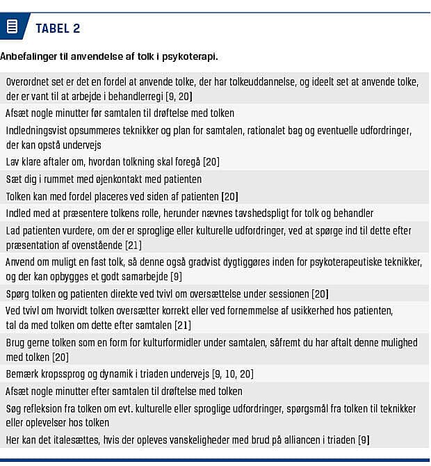 at opnå en sufficient kommunikation. Formålet med denne artikel er at give et indblik i, hvad den videnskabelige litteratur har vist om tolkens påvirkning af den psykoterapeutiske behandling. På baggrund af denne eksisterende viden gives der afslutningsvis anbefalinger til anvendelse af tolk i psykoterapi. Den inkluderede litteratur kan ses i Tabel 1, mens anbefalingerne kan ses i Tabel 2.