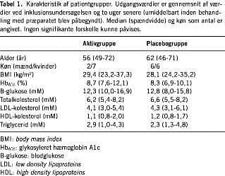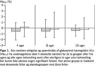 Der blev observeret et fald i HbA1c i aktivgruppen mellem inklusionsundersøgelsen og undersøgelsen to uger senere, hvor behandling med testproduktet blev påbegyndt. En lignende tendens sås i placebogruppen (median (spændvidde) for henholdsvis aktivgruppen: 9,3 (7,7-11,9) og 8,5 (6,5-12,3) og placebogruppen: 9,1 (7,5-10,0) og 8,1 (5,8-10,1)).