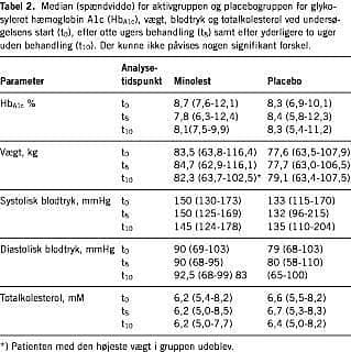 Resultater: Der kunne ikke påvises nogen signifikant påvirkning af faste-B-glukose, Hb A1c , totalkolesterol, HDL- og LDL-kolesterol samt triglycerider eller vægt og blodtryk efter otte ugers behandling med Minolest.