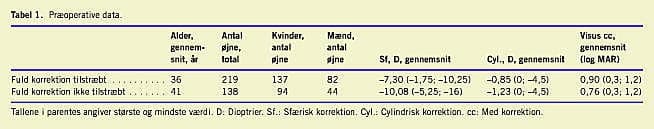 I Tabel 1 gives en oversigt over de væsentligste præoperative data. Langt de fleste øjne havde moderat til høj myopi. Ti øjne havde en præoperativ korrektion under -6 D (sfærisk ækvivalent), hvoraf otte var -5 til -6 D, et var -2,63 D og et var -3,88 D. Graden af myopi var for 138 øjne så høj, at man ikke kunne korrigere fuldt ved LASIK-operation (præoperativ refraktion minus tilstræbt korrektion var -0,5 D eller mere).