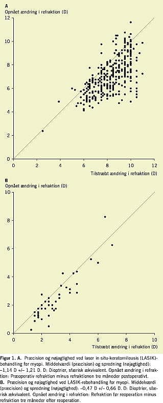I Figur 1A og B illustreres sammenhængen mellem tilstræbt og opnået ændring i graden af nærsynethed. Middelværdi og standarddeviation (SD) for den refraktive »fejl«, beregnet som forskellen mellem tilstræbt og opnået refraktionsændring, var for primær operation -1,14 D +/- 1,21 D og for reoperation -0,47 D +/- 0,66 D. Dvs. en generel underkorrektion. Som det også fremgår af Figur 1A, var refraktionsfejlen større for de høje dioptrier end for de lave. Ved præoperativ myopi under -8 D var refraktionsfejlen -0,80 D +/- 0,83 D, mens den for præoperativ myopi på -8 D og derover var -1,37 D +/- 1,33 D.