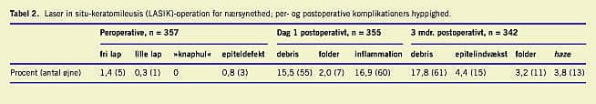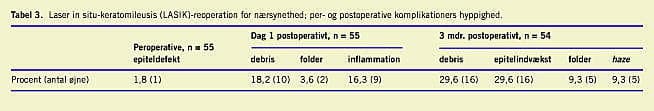I Tabel 2 og Tabel 3 gives en oversigt over de registrerede komplikationer ved primær operation og reoperation. Peroperative komplikationer var meget sjældne. Postoperativt efter primær operation forekom debris (mucus) (61 øjne, 18%) og inflammation (60 øjne, 17%) i grænselaget mellem LASIK-lappen og det underliggende hornhindevæv ret hyppigt. Efter reoperation var debris (16 øjne, 30%) og inflammation (ni øjne, 16%) sammen med epitelindvækst (16 øjne, 30%) de hyppigste komplikationer. I et tilfælde, dvs. 0,3% af de primært opererede øjne, var der efterfølgende behov for løft og skyl under hornhindelappen. Epitelindvækst var hyppigere efter reoperation end efter primær operation. Kun et tilfælde, dvs. 1,9% af de reopererede øjne, var klinisk signifikant (central epitelindvækst) og krævede reoperation.