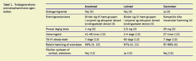 zymet, okkuperer noget af bindingstedet for substraterne (androstenedion og testosteron) og blokerer derved østrogensyntesen [12]. Ved peroral indgift af anastrozol (1 mg dagligt) og letrozol (2,5 mg dagligt) hæmmes aromataseaktiviteten med op til henholdsvis 99% og 97% [4, 12]. Begge medikamenter sænker østrogenkoncentrationen i tumorvævet. De hyppigste bivirkninger ved brug af anastrozol er hedeture, led-smerter og humørsvingninger [5]. Letrozol har tilsvarende bivirkninger med hedeture, træthed og øget svedtendens [8].