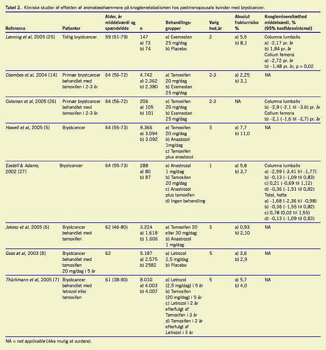 BMD prædikterer forekomsten af frakturer i befolkningen. En reduktion i BMD på 1 standarddeviation (ca. 10%) øger således risikoen for frakturer med en faktor 1,5-2,8, og risikoen for frakturer stiger efter menopausen i takt med faldet i BMD [29]. Når en farmakologisk behandling reducerer BMD i forhold til ubehandlet kontrol, må man derfor forvente, at frakturrisikoen øges hos denne population. Lønning et al [25] fandt imidlertid ingen øget forekomst af frakturer hos patienter, der var behandlet med exemestan i 24 måneder, sammenlignet med patienter, der var behandlet med placebo i 24 måneder. Antallet af frakturer var imidlertid lille (fire henholdsvis fem), og studiet havde ikke statistisk styrke til at, at man kunne påvise ændringer i frakturrisiko. I ATAC [5, 27] , som omfattede 5.216 kvinder, var risikoen for alle frakturer signifikant øget ved behandling med anastrozol sammenlignet med tamoxifen efter 33 måneder og 68 måneder, ligesom risikoen for vertebrale frakturer var signifikant øget efter 68 måneder. Der kunne ikke påvises signifikant forskel i risikoen for hoftebrud. I det kombinerede ABCSG trial 8 og ARNO 95 trial (n = 3.224) [6] blev postmenopausale kvinder med brystcancer efter to års tamoxifenbehandling (20 mg eller 30 mg pr. dag) randomiseret til enten fortsat tamoxifen eller anastrozol 1 mg pr. dag. Efter i alt fem års behandling var hyppigheden af frakturer signifikant højere i anastrozolgruppen (34 vs. 16), men det blev ikke beskrevet, hvilken type frakturer det drejer sig om. Goss et al [8] (MA-17 study) randomiserede postmenopausale kvinder, som havde fået fem års behandling med tamoxifen, til enten fem års videre behandling med letrozol (2,5 mg pr. dag) eller placebo (n = 5.187). Efter 2,4 år var der en tendens til flere tilfælde af nydiagnostiseret osteoporose i letrozolgruppen end i placebogruppen (p = 0,07). Der var samtidig en tendens til flere frakturer i letrozolgruppen end i placebogruppen (3,6% vs. 2,9%, p = 0,24), men heller ikke her blev det rapporteret, hvilken type frakturer det drejede sig om. I BIG-1-98-studiet [7], som omfattede 8.010 postmenopausale kvinder, var forekomsten af frakturer signifikant højere under behandling med letrozol end under behandling med tamoxifen (5,7% vs. 4,0%, p < 0,001) givet som primær adjuverende behandling. Samme tendens blev observeret i IES (exemestan vs. tamoxifen) [26]. Coombes et al [14] randomiserede postmenopausale kvinder, som havde brystcancer (n = 4.742) og havde fået 2-3 års behandling med tamoxifen (20 mg pr. dag) til enten fortsat tamoxifen eller exemestan (25 mg pr. dag) indtil i alt fem år. Selv om der blev rapporteret om flere frakturer i exemestangruppen end i tamoxifengruppen (3,1% vs. 2,3%), var dette ikke statistisk signifikant (p = 0,08). Det blev ikke rapporteret, hvilken type frakturer det drejede sig om.