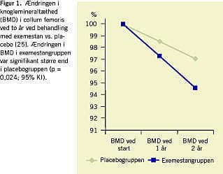 (Figur 1 ), mens der ikke var nogen signifikant effekt i columna lumbalis. I [26] undersøgte man effekten af exemestan (25 mg pr. dag) eller tamoxifen (20 mg pr. dag) hos 206 kvinder, der havde brystcancer og alle havde fået tamoxifen i 2-3 år. Præliminære data viste, at exemestan reducerede BMD i columna lumbalis med 2,9% og i collum femoris med 2,1% efter et år, mens knogletabet ved tamoxifen var 0,02% i columna lumbalis og 0,5% i collum femoris. I et substudie i Anastrozole, Tamoxifen, Alone or in Combination-Trial (ATAC), som omfattede 288 patienter reducerede anastrozol (1 mg pr. dag) BMD i columna lumbalis med 2,6%, og i hoften med 1,7% [27]. Sammenlignet hermed så man kun et fald i BMD på 0,4% i columna lumbalis og et fald på 0,1% i total hofte-BMD i den ubehandlede gruppe [27]. For gruppen af patienter behandlet med tamoxifen steg BMD med 1,0% i columna lumbalis og 0,5% i hoften. Hos patienterne med kombinationsbehandling så man en øgning i BMD på 0,2% i columna lumbalis og 0,8% i hoften [27]. Det er uvist, om knogletabet under AH-behandling vedvarer ved længere tids behandling eller som det postmenopausale knogletab aftager efter 5-10 år [28].