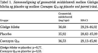 Studiet blev udført som et randomiseret, dobbeltblindt overkrydsningsforsøg med tre behandlingsperioder af fire ugers varighed, hver adskilt af en udvaskningsperiode på to uger. I hver af de tre behandlingsperioder indtog patienten en gang dagligt henholdsvis en kapsel CoQ10 100 mg + en placebotablet, en placebokapsel + en tablet Ginkgo biloba 100 mg, og en placebokapsel + en placebotablet. Den anvendte dosis af CoQ10 var således højere end den almindeligt anvendte dosis. Da Ginkgo bilo ba og CoQ10 af tekniske årsager ikke kan fremstilles på samme måde (blød gelatinekapsel/tablet), måtte patienterne af hensyn til optimal blinding af studiet i hver periode tage dels en tablet og dels en kapsel. Studiemedicinen var kapsler Bio-Qinon Q10 indeholdende ubidecarenon (Coenzym Q10) 100 mg, tabletter Bio-Biloba indeholdende 100 mg ekstrakt af Ginkgo biloba- blad svarende til 24 mg ginkgoflavonglycosid og 6 mg terpenlaktoner samt placebotabletter og placebokapsler.