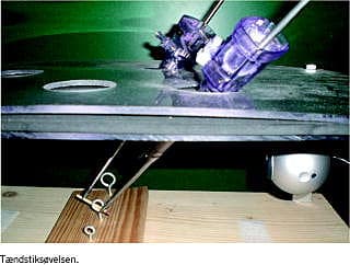 Der blev anvendt en tidligere beskrevet model til at optræne psykomotorisk koordination ved laparoskopisk kirurgi [5]. Der blev anvendt to øvelser, hvoraf den ene anvendtes til at vurdere koordinationsevnen mellem højre og venstre hånd. Øvelsen indebærer, at man fatter en tændstik med højre hånds grasper og fører den igennem fire huller, der aftager i diameter fra højre til venstre - et hul ad gangen. Observatøren måler, hvor lang tid øvelsen tager, samt antallet af tilfælde, hvor tændstikken tabes. Den anden øvelse omhandler rumopfattelse med placering af titanium tacs på en gummimembran, der er opspændt på en boks. Observatøren måler, hvor lang tid øvelsen tager, samt om der er tacs placeret uden for de fem punkter på gummimembranen, som på forhånd var indtegnet.