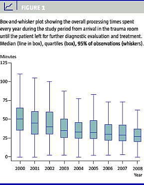 Resultaterne er baseret på 4.493 indkomne patienter med traumekald i perioden, af hvilke 1.102 patienter (24%) havde en ISS > 15. For hele patientkohorten var den mediane totaltid brugt på traumestuen 50 min i 2000, og den udviste et kontinuerligt fald til 27 min i 2008 (p < 0,0001, Kruskal-Wallis test). Den mediane tid fra ankomst til det første røntgenbillede af thorax forelå, blev i observationsperioden reduceret fra 7 min i 2001 til 5 min i 2008 (p < 0,024, Kruskal-Wallis test). For patienter med ISS > 15 blev der noteret sammenlignelige signifikante tidsreduktioner.