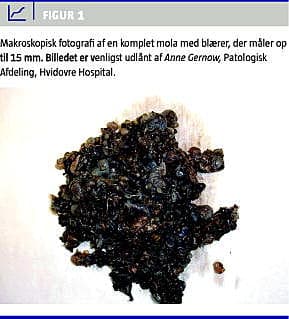 Ovarielt hyperstimulationssyndrom (OHSS) ses oftest som iatrogent induceret i forbindelse med anvendelse af gonadotropiner i fertilitetsbehandling. Patofysiologien er delvist ukendt. Den vaskulære permeabilitet øges, og væskeskift fra det intra- til det ekstravaskulære rum fører til hypovolæmi og hæmokoncentration. I lette tilfælde ses der forstørrede polycystiske ovarier og gastroentestinale gener; i svære tilfælde ses der elektrolytforstyrrelser, hydrothorax, ascites, nyresvigt og koagulationsforstyrrelser. OHSS kan være livstruende. Spontant OHSS ved molagraviditet er sjældent og kun kasuistisk beskrevet [1, 2]. Mola hydatidosa skyldes en abnorm befrugtning med to sæt paternelle og eventuelt et ekstra sæt maternelle kromosomer. Histologisk kan mola inddeles i komplet, der oftest er diploid, og partiel, der oftest er triploid. Makroskopisk ses der blæredannelse af villi chorii (Figur 1 ). Ved partiel mola kan der ses fosteranlæg, der oftest vil være svært misdannet. Vi præsenterer en sygehistorie med spontant OHSS efter en afsluttet graviditet, der histologisk viste partiel mola.