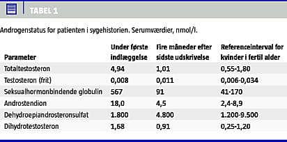 To dage efter blev patienten indlagt med mave-smerter. Abdomen var udspilet, uterus velkontraheret, og patienten var afebril. En ultralydundersøgelse viste væske i fossa Douglasi og bilaterale polycystiske ovarier hver med en diameter på 14 cm. Patienten responderede på behandling med laksantia og blev udskrevet efter to dage. Tre dage senere blev hun genindlagt pga. tiltagende mavesmerter, kortåndethed og ødemer. Ved fornyet ultralydundersøgelse sås der 1 l ascites, uændrede store polycystiske ovarier og en tom uterinkavitet. Blodprøver viste hyponatriæmi, hypoalbuminæmi og faldende serum (S)-humant choriongonadotropin (hCG)-værdier fra 151.000 til 5.220 IE/l. Østradiolkoncentrationen var > 13.000 pmol/l (midtcyklus 240-2.400 pmol/l), cancerantigen (CA)-125 var 1.340 kIE/l (< 35), og flere androgenmetabolitter var svært forhøjede (Tabel 1 ). På mistanke om OHSS blev patienten behandlet med intravenøst indgivet væske, diuretika, smertestillende midler og tromboseprofylakse. En røntgenundersøgelse af thorax viste normale forhold. Symptomerne aftog gradvist, og patienten blev udskrevet ni dage efter genindlæggelsen. Fire måneder senere var alle blodprøverne og ovarierne normale.