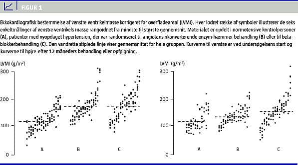 Alle 30 inkluderede patienter fik foretaget ekkokardiografi før den antihypertensive behandling blev påbegyndt og igen efter et års behandling, mens kun 11 af de 14 normotensive kontrolpersoner fik lavet den anden skanning. Figur 1 illustrerer samtlige seksdobbelte målinger af LVMI fordelt mellem de forskellige grupper og rangordnet efter stigende middelværdi. I grupperne varierede den intraindividuelle standardafvigelse fra 12-18 g/m2 . Gennemsnitlig LVMI hos de perindoprilbehandlede patienter blev signifikant reduceret med 14%, men forblev uændret hos atenololbehandlede patienter. Gennemsnitlig LVMI hos de ti kontrolpersoner, der blev skannet begge gange, ændredes ikke signifikant over tid (fra 110 til 118 g/m2 , p = ikkesignifikant).