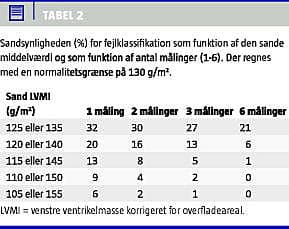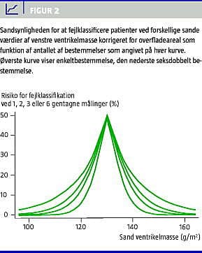 Resultater: I gennemsnit var LVM hos ubehandlede patienter 145 g/m 2 og hos raske kontrolpersoner 105 g/m 2 . Der var stor spredning på målinger af LVM (standardafvigelse = 12-18 g/m 2 ) og sandsynligheden for ved enkeltmålinger at fejlklassificere en person med normal LVM som havende LVH (her defineret som > 130 g/m 2 ) og vice versa var stor. Seksdobbelte bestemmelser reducerede denne risiko fra 20% til 6% hos personer med LVM på 120 eller 140 g/m 2 og fra 13% til 1% hos personer med LVM på 115 eller 145 g/m 2 . Hos personer med LVM meget tæt på 130 g/m 2 forblev risikoen dog forholdsvis høj trods gentagne målinger.