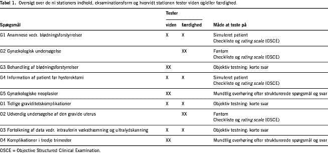 Til eksamen i gynækologi og obstetrik på H:S Hvidovre Hospital i december 2002 og juni 2003 planlagde vi en modificeret OSCE. Ved eksamen i december 2002 bestod den af i alt ni stationer, fem inden for gynækologi og fire inden for obstetrik. Af Tabel 1 fremgår det, at tre stationer testede overvejende viden, to stationer overvejende færdigheder, mens fire stationer testede såvel viden som færdigheder. Stationernes rækkefølge blev bygget op således, at der blev tilstræbt en logisk rækkefælge med en station, hvor der skulle optages en anamnese vedrørende blødningsforstyrrelser på en simuleret patient (professionel skuespiller), ved næste station skulle der foretages en gynækologisk undersøgelse på et fantom, efterfølgende station bestod af skriftlige spørgsmål om behandling af blødningsforstyrrelser, og ved den følgende station skulle en anden simuleret patient informeres om hysterektomi. Inden for obstetrik skulle studenterne først svare på skriftlige spørgsmål om tidlig graviditet (bl.a. ud fra et ultralydbillede), på næste station skulle de vurdere størrelsen af en gravid uterus på et fantom, herefter skulle de på en station fortolke data vedrørende intrauterin væksthæmning bl.a. ud fra en vandrejournal. Inden for både gynækologi og obstetrik var der en station med mundtlig overhøring ud fra et struktureret skema. Studenterne startede således alle ved station G1 eller O1 (Tabel 1) og færdiggjorde det ene subspeciale, før de gik i gang med det næste.