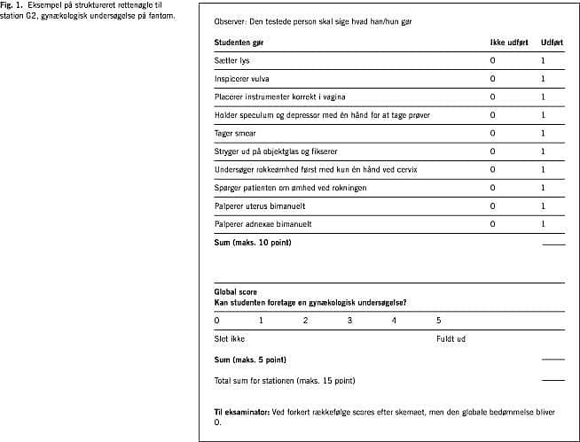 Der var afsat seks minutter til hver station og dobbelt varighed til de to mundtlige overhøringer samt et minut til at skifte mellem st ationerne. For alle stationer var der udarbejdet entydige spørgsmål, rettenøgler (Fig. 1 ) og checklister. Femogtyve medicinstuderende gennemførte eksamen, der resulterede i, at en student fik karakteren 7, en fik 8, ti fik 9, elleve fik 10, og to fik 11. Den gennemsnitlige karakter var 9,5. Studenterne vurderede egen præstation efter eksamen, og der var overensstemmelse eller højst en karakter til forskel mellem egen vurdering og den faktiske karakter for alle studenter på nær én.