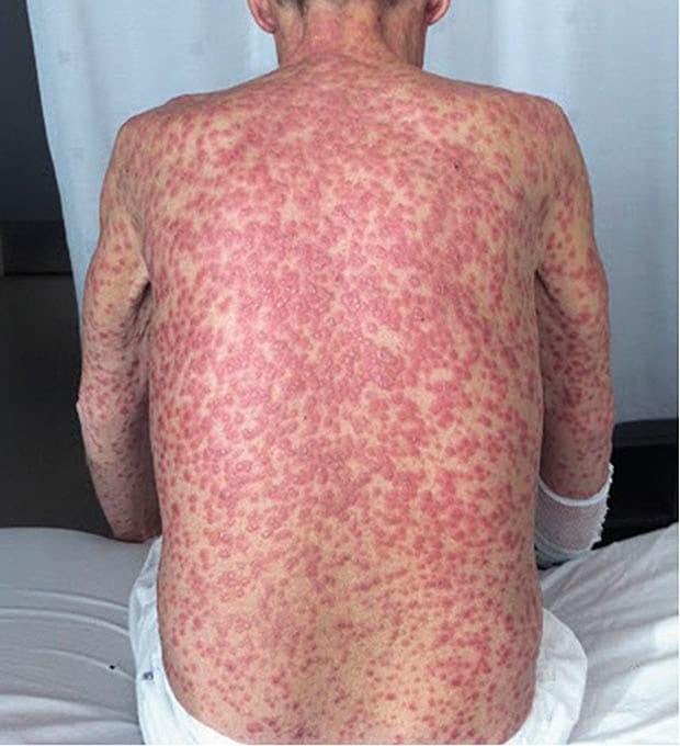 Gennem tre uger havde han haft et universelt makulopapuløst eksantem, der ikke var kløende eller ømt. CD4-tallet var 44 celler/mikroliter, og Hiv-RNA var 56.000 kopier/ml. En syfilisscreening havde vist Wassermanns reaktion (WR) på 0 og rapid plasma reagin (RPR)-test på 0. Han blev henvist til hudlæge, som på det foreliggende fik mistanke om guttat psoriasis eller lymfoproliferativ sygdom. En stansebiopsi viste superficiel og dyb lymfohistiocytær infiltration med plasmaceller, og immunhistokemisk farvning for Treponema pallidum var positiv. En kontrol af syfilisserologi viste nu WR 1 og RPR 0, suppleret med Treponema pallidum flagellum-antistof-immunglobulin (Ig)G på 0 og IgM på 2. Udslættet svandt betydeligt efter 14 dages højdosispenicillinbehandling. Ved en lumbalpunktur afkræftedes mistanken om neurosyfilis.