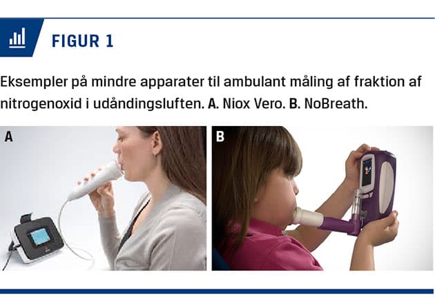 Inhalationssteroider (ICS) er de mest effektive medikamenter til forebyggende astmabehandling, men de er især virksomme ved type 2-astma. Derfor er det vigtigt at finde ud af, om patienter med astmasymptomer har type 2-inflammation for at målrette behandlingen. Fremkomsten af biologisk behandling med monoklonale antistoffer rettet mod blandt andet immunglobulin (Ig) E, IL-5, IL-13 og IL-4, som anvendes til patienter med meget svær astma, har øget fokus på udviklingen af pålidelige inflammationsmarkører [2]. Markørerne for type 2-astma er blandt andet IgE, eosinofile i blod eller induceret sputum, og fraktion af nitrogenoxid i udåndingsluften (FeNO). FeNO, som blev udviklet allerede for ca. 20 år siden, kan i dag måles online i udåndingsluften (Figur 1) og har fundet stor udbredelse i astmaambulatorierne til diagnostik samt monitorering af astma af alle sværhedsgrader og omtales i de internationale astmaguidelines [5-9]. I denne artikel vil vi beskrive måling af FeNO-værdi og diskutere dens anvendelighed til diagnostik og behandling af astma og ved udredning af patienter, der har luftvejssymptomer uden kendt astma.