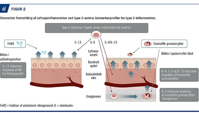 Astma opfattes i dag som en paraplybetegnelse for en bred vifte af sygdomme, som adskiller sig med hensyn til forløb, respons på behandling og den underliggende luftvejsinflammation til trods for en række kliniske fællestræk [1]. Mens man tidligere primært skelnede mellem atopisk og nonatopisk astma, opdeles sygdommen i dag blandt andet ud fra typen af de inflammatoriske celler i luftvejene i eosinofil astma, neutrofil astma, blandet eosinofil-neutrofil astma og såkaldt pauciinflammatorisk astma, hvor der er relativt få inflammatoriske celler [2]. Sidst i 1980’erne indførtes betegnelserne Th1- og Th2-astma efter opdagelsen af to forskellige kloner af T-lymfocytter (CD4+ T-hjælper (Th)-celler), som har hver deres cytokinsekretionsprofil. Th1-celler, som blandt andet secernerer interleukin (IL)-2, interferon-gamma og lymfotoksin-alfa, og Th2-celler, som blandt andet secernerer IL-4, IL-5, IL-9 og IL-13. Nomenklaturen er siden blevet ændret til type 1-astma og type 2-astma efter opdagelsen af, at også andre celler end lymfocytter kan secernere de involverede cytokiner. Man kan således tale om, at en given patient kan have astma med overvejende type 2-inflammation eller astma med overvejende type 1-inflammation, hvor sidstnævnte pga. mangel på en klar definition i dag ofte benævnes non-type 2-inflammation [2].