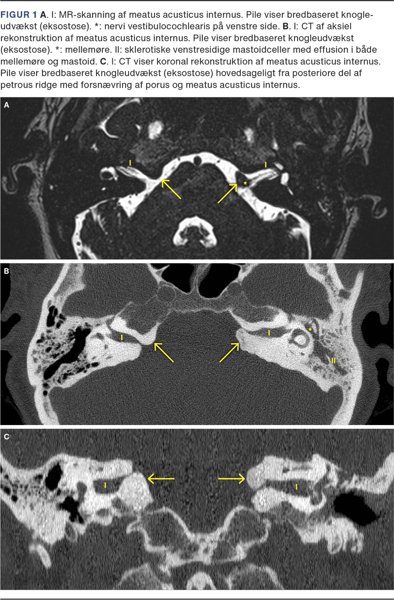 Som fireårig havde patienten haft et faldtraume, hvor hun fik kraniebrud og lå i respirator gennem noget tid. Patienten havde sequelae i form af hjerneskade og muligvis epilepsi som følge heraf. Der forelå ingen billeddiagnostik fra patientens barndom. I forbindelse med udredning af det perceptive asymmetriske høretab blev der foretaget MR-skanning, som viste bredbaseret knogleudvækst hovedsageligt fra den posteriore del af petrous ridge med forsnævring af IAC (Figur 1 A), hvor der sås masseeffekt og kontakt med nervus vestibulocholeraris på begge sider. Cochlea og buesystem sås normale bilateralt.