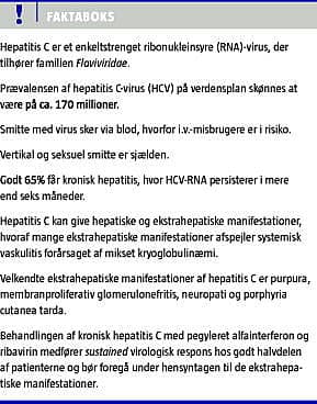 Hepatitis C-virus (HCV) er et enkeltstrenget ribonukleinsyre (RNA)-virus [1], som har seks genotyper [2], hvoraf genotype 1 er den hyppigst forekommende i den vestlige verden [1]. HCV transmitteres blodbårent, og det formodes, at prævalensen af kroniske HCV-inficerede personer i Danmark er på 10.000-15.000, men med langt færre tilfælde anmeldt [3]. HCV giver typisk leverpåvirkning, men hos op til 40-74% af de smittede udvikles der også ekstrahepatiske manifestationer [2, 4], herunder også ikkeorganrelaterede symptomer [5]. Mikset kryoglobulinæmi (MC) er associeret med HCV [4] og forårsager systemisk vaskulitis i de små kar, hvilket er årsag til nogle af de ekstrahepatiske manifestationer [5]. MC-symptomerne er milde, og MC giver kun kliniske symptomer i 5-10% af alle HCV-tilfælde [6]. De hyppigste manifestationer med baggrund i et MC-syndrom er palpabel purpura, siccas syndrom, Raynauds fænomen, nyrepåvirkning og neuropati [5, 6]. Ved manifestationer, som ikke er forårsaget af MC, men observeret sammen med HCV, er patogenesen ikke lige så belyst som ved MC, og de rapporterede manifestationer varierer fra velundersøgte plausible sygdomsmanifestationer til enkeltobservationer [5].