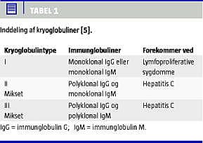 Kryoglobuliner er immunglobuliner, som præcipiterer ved en temperatur under 37 °C, og som opløses igen ved genopvarmning [4, 6]. Kryoglobulinæmi inddeles i tre typer (Tabel 1 ), hvor immunglobulin M har reumatoid faktor (RF)-egenskab. Ved MC aflejres kryopræcipitaterne og forårsager systemisk vaskulitis [4, 8]. Paradoksalt korrelerer sværhedsgraden af en HCV-infektion med HCV-viræmigraden og ikke af mængden af serumkryoglobuliner [7]. Kryoglobulinæmi er en af de ekstrahepatiske manifestationer, der er velundersøgt og stærkt associeret med HCV [5]. Prævalensen af kryoglobuliner varierer dog i et bredt spektrum på 2-66%. Den brede variation skyldes formentligt metodologiske aspekter som geografisk variation, selektionskriterier, alder og tilstedeværelse af cirrose [2].