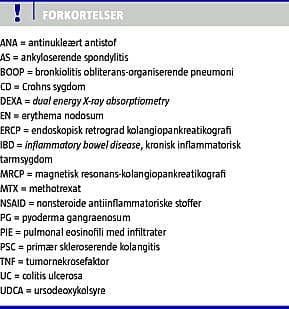 Colitis ulcerosa (UC) og Crohns sygdom (CD) er de to hovedsygdomme under fællesbetegnelsen kronisk inflammatorisk tarmsygdom (IBD). I Danmark er incidensen af UC 13,4 pr. 105 og af CD 8,6 pr. 105 [1]. Ætiologien er ukendt, og ud over tarminflammation er der også ekstraintestinale manifestationer [2-6].
