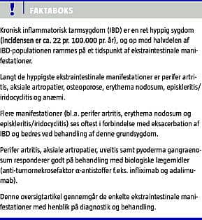 Summary Extraintestinal manifestations in inflammatory bowel disease Ugeskr Læger 2009;171(43):3078-3083 Extraintestinal manifestations are relatively common in chronic inflammatory bowel disease and affect joints, skin, eyes and bile ducts. The most frequent rheumatologic manifestations are peripheral arthritis and axial arthropathies. Erythema nodosum and pyoderma gangraenosum are common dermatological manifestations, while episcleritis, iridocyclitis and uveitis are common ophthalmological complications. Conventional drugs and biologicals have proven effective in the treatment of several of the manifestations, including peripheral arthritis, pyoderma gangraenosum and episcleritis.