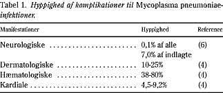 Der er beskrevet talrige komplikationer fra næsten alle organsystemer i forbindelse med M. pneumoniae-infektioner. Komplikationerne ses typisk fra få dage til nogle uger efter debut af øvre luftvejssymptomer. Tilfælde uden forudgående primærsymptomer kan dog forekomme (4, 6, 7). I Tabel 1 er de kendte følgetilstande til M. pneumoniae-infektioner summeret med angivelse af hyppigheder, som de er beskrevet i litteraturen. Formålet med dette arbejde er at belyse hyppigheden samt forløbsformen af komplikationer ved infektioner med M. pneumoniae hos patienter, der er indlagt på hospital. Således blev journaler på patienter med M. pneumoniae-infektion, der var undersøgt på Rigshospitalets epidemiklinik i perioden 1994-2000, retrospektivt gennemgået.