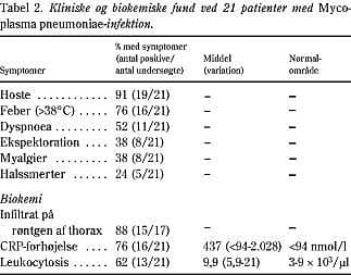 Resultater: De primære symptomer var feber, hoste og dyspnoea. Biokemisk fandtes leukocytose og C-reaktiv protein (CRP)-forhøjelse. Hos 88% af patienterne fandtes infiltrat ved røntgenundersøgelse af thorax. Der indgår 21 personer i undersøgelsen. Ud af disse 21 har 18 fået foretaget PCR-undersøgelse af luftvejssekret, og alle fandtes positive for Mycoplasma pneumoniae- antistof. I alt 14 personer har fået målt Mycoplasma pneumoniae- antistof, og alle fandtes positive. I alt syv af de 21 patienter, der var indlagt på hospitalet, udviklede ekstrapulmonale komplikationer i form af: encephalitis (3), polyradiculitis (1), transversel myelitis (1), hæmolytisk anæmi (2), kardiale arytmier (1) og erythema multiforme (3). Komplikationerne viste sig fra 12 til 29 dage efter debut af lungesymptomerne. Tre patienter havde flere komplikationer samtidig.