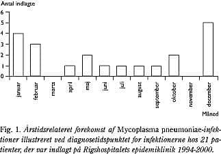 De kliniske data for ti mænd og 11 kvinder i alderen 15-85 år (gennemsnit 39 år), der var indlagt på Rigshospitalets epidemiklinik med M. pneumoniae-infektion er summeret i Tabel 2. De primære symptomer var feber, hoste og dyspnoea. Hos 88% af patienterne sås infiltrat ved røntgenundersøgelse af thorax, ligesom der typisk var leukocytose og CRP-forhøjelse. Måneden for diagnosetidspunktet fremgår af Fig. 1.