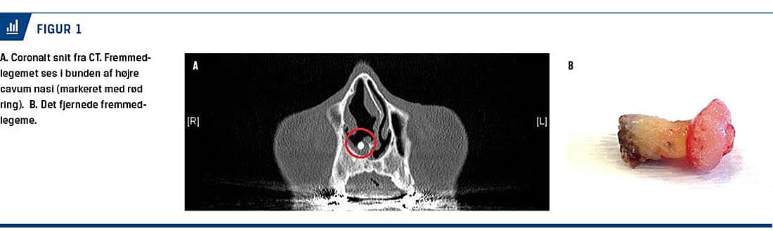 En 71-årig mand blev henvist til en øre-næse-hals-afdeling fra en privatpraktiserende øre-næse-hals-læge pga. et fremmedlegeme i højre næsekavitet. Patienten havde i ca. tre måneder haft tiltagende gener fra det højre næsebor, hvor der initialt blev beskrevet irritation og sekretdannelse (»snue«), hvilket gradvist havde udviklet sig til et purulent og ildelugtende flåd. Generne var ensidige. Patienten opsøgte den henvisende speciallæge, som behandlede infektionen, hvorefter der blev rejst mistanke om et fastsiddende fremmedlegeme. Han blev henvist til en CT af ansigtsskelettet, hvor der blev verificeret et hårdt, formentlig metallisk, fremmedlegeme i bunden af højre næsekavitet (Figur 1).