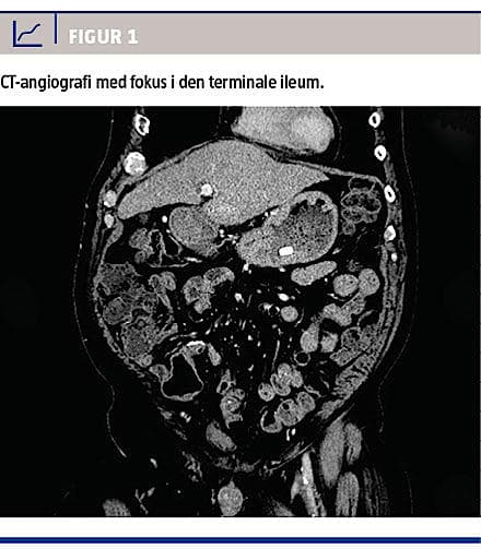 På mistanke om atrioventrikulær malformation supplerede man med en blødningsscintigrafi, som viste blødningsfokus i den terminale ileum. Retrospektivt kunne dette også ses på CT-angiografien (Figur 1). Da patienten var ude af sin koma og forventedes at kunne overleve kirurgi, fandt man ved laparotomi en venøs forbindelse fra en varicøs, umbilikal vene til den terminale ileum, hvor der var varicer. Man foretog tyndtarmsresektion af det afficerede område med anlæggelse af en primær anastomose. Det postoperative forløb var ukompliceret, og patienten gik på en længere orlov efter syv dage og havde fire måneder efter ikke været indlagt igen. Patologisvaret bekræftede, at der var tale om varicer i den terminale ileum.