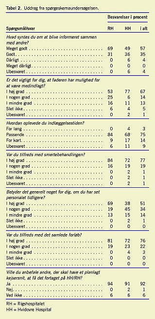 En af hovedbekymringerne ved indførelsen af teamstrukturen har været, om det ville give de fødende en oplevelse af at blive behandlet på samlebånd. Ser man på resultaterne (Ta-bel 2) af spørgeskemaundersøgelsen, synes dette ikke at være tilfældet. 98% var tilfredse med det samlede forløb, og 92% kunne anbefale andre at få foretaget kejsersnit på det hospital, de selv havde været indlagt på. Der var i øvrigt ikke den store forskel på tilfredsheden mellem patienter, der havde været indlagt på de to hospitaler.