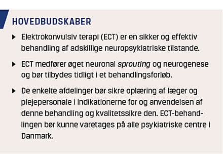 Effekten af ECT på flere neuropsykiatriske tilstande er indiskutabel. Frygten for permanente skader på centralnervesystemet er ubegrundet [24]. Der foreligger solid eksperimentel forskning, som viser såvel neurogenese som neuronal sprouting hos mus og øget hippokampal volumen hos patienter, der er blevet behandlet med ECT [25, 26].