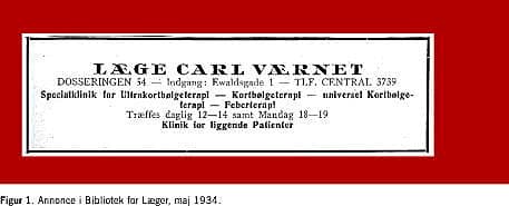 I februar 1934 bragte Ugeskrift for Læger en ottesiders artikel af læge Carl Værnet om kortbølgeterapi [1]. Artiklen imponerer med en hel sides referencer. Forfatteren havde studeret behandlingen i udlandet og åbnede en klinik for behandling med kortbølger i 1934 (Figur 1 ). Han synes at have været den, der introducerede behandlingen i Danmark. Han interesserede sig også for kønshormoner, et emne som var blevet aktuelt i 1930'erne. Denne interesse endte for ham i total menneskelig fornedrelse i form af eksperimenter på koncentrationslejrfanger [2]. I begyndelsen af det 20. århundrede var varmebehandling med langbølgediatermi blevet udviklet i USA. Kortbølgebehandling blev introduceret omkring 1929 i Frankrig og USA som en universel behandling til fremkaldelse af kunstig feber bl.a. ved behandling af neurolues. En sådan mange timer varende hypertermi må have kunnet aktivere hypothalamus-hypofyse-aksen og give en mærkbar steroideffekt. I Tyskland udviklede lægen Schliephake den lokaliserede kortbølgeterapi og udførte den første behandling på sig selv i 1929. Han behandlede en furunkel ved sin næse og fandt en hurtig god virkning [3]. Han havde også forhåbning om at påvise effekt ved tuberkulose og kræft. Allerede her ser man et diskussionsemne, som siden har fulgt elektroterapien, dukke op. Skyldes virkningen udelukkende opvarmningen, som de skeptiske amerikanere mente, eller er der nogle ekstratermiske, biologiske virkninger, sådan som det blev fremført især fra tysk side? I 1936 bragte Ugeskriftet flere artikler fra Finseninstitutets medicinske afdeling, hvor kortbølgebehandling var indført i 1935. Man havde behandlet patienter med bronkial astma, kronisk bronkitis og bevægeapparatslidelser ved hjælp af universelle kortbølger. Konklusionen blev, at reumatiske lidelser og lokaliserede infektioner var særlig velegnede til kortbølgebehandling.