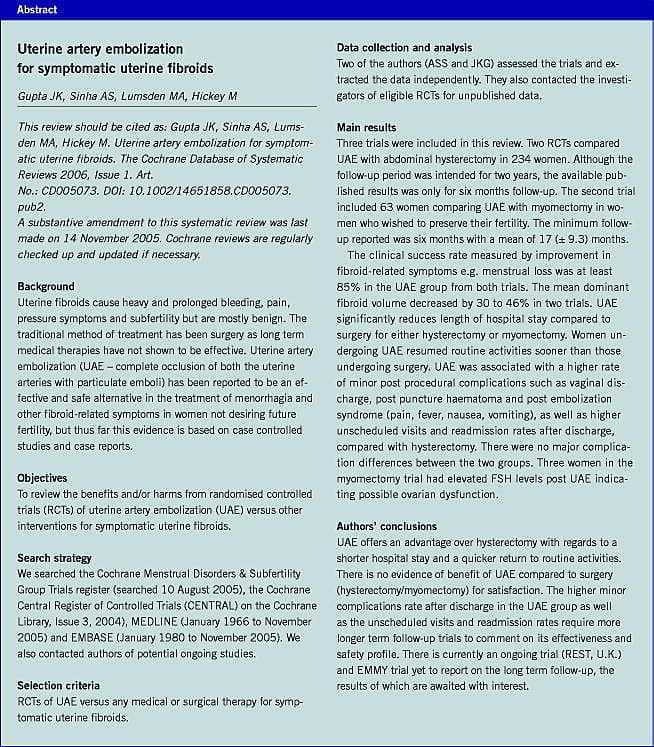 - Gupta JK, Sinha AS, Lumsden MA et al. Uterine artery embolization for symptomatic uterine fibroids. The Cochrane Database of Systematic Reviews 2006, Issue 1. Art. No.: CD005073. DOI: 10.1002/14651858.CD005073.