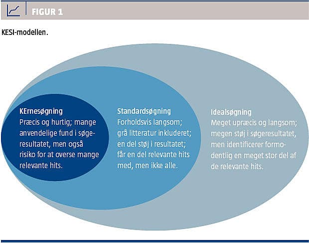 Det er en god ide at udvikle søgeprotokollen i samarbejde med f.eks. opdragsgiver, projektgruppe, fagfolk og informationsspecialister på lokale videncentre. Omfanget af et review kan variere afhængigt af tidsperspektivet og emnet. En måde at afgrænse og tilpasse søgningen på er ved at udvælge informationskilder efter kerne, standard og ideal (KESI)-modellen (Figur 1) [15].
