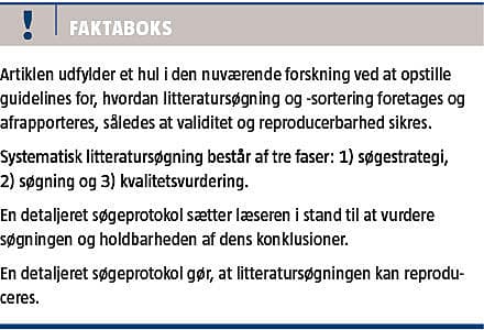 Denne artikels bidrag er at angive retningslinjer for, hvordan udarbejdelse af gode søgninger og afrapporteringer opnås med henblik på høj validitet og reproducerbarhed.