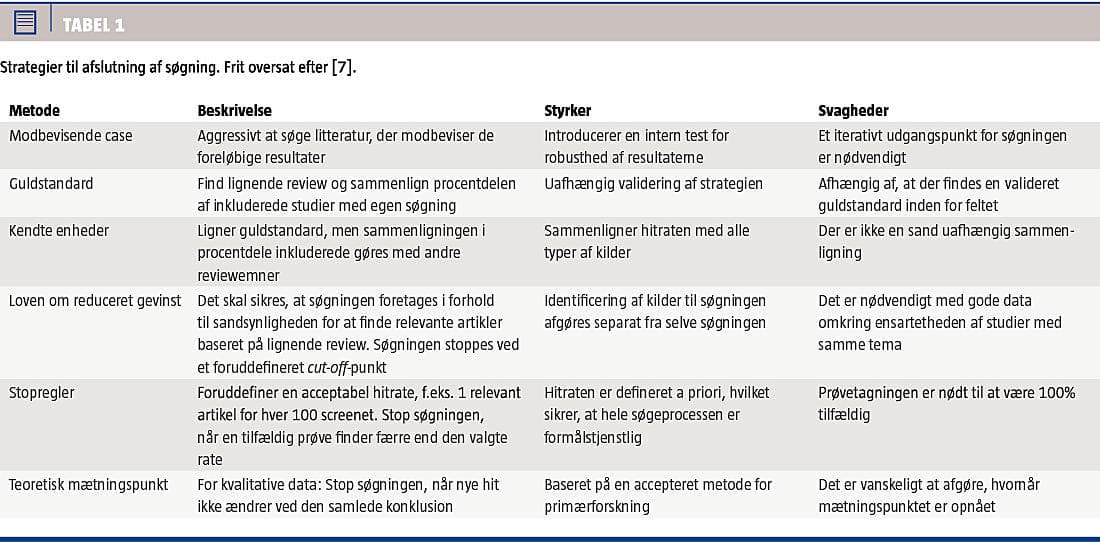 Til vurdering af, hvornår litteratursøgningen er tilstrækkelig, findes der forskellige metoder. I Tabel 1 præsenteres otte forskellige strategier sammen med deres styrker og svagheder. Ingen af metoderne er baseret på evidens, men det vil imidlertid altid være en styrke for en hvilken som helst søgning med henvisning til en faktisk strategi for afslutning af en den.