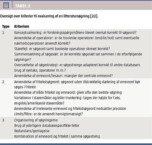 Tre typer af kriterier for evaluering af en litteratursøgning