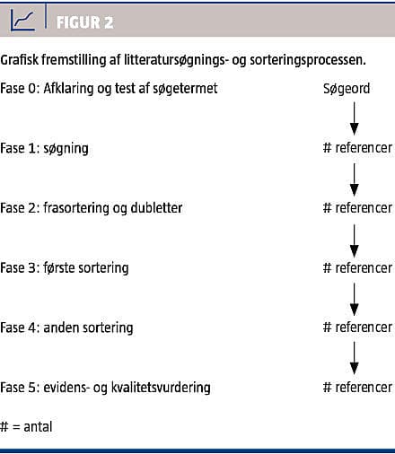 Sortering af litteratur kan foretages i fire faser [25]: 1) udvælg litteratur med det højeste umiddelbare evidensniveau, 2) anvend det fokuserede spørgsmål (PICO) til at vurdere, om artiklen er relevant, 3) anvend tjeklister ved gennemgang af de enkelte artikler og 4) anvend internationalt anerkendte standarder til vurdering af artikler.