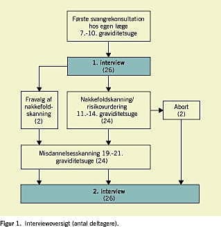 Materiale og metoder: Seksogtyve gravide blev interviewet efter første svangrekonsultation og igen efter misdannelseskanningen. Undersøgelsesresultaterne i denne artikel stammer primært fra første interviewrunde og vedrører de 24 gravide, der valgte nakkefoldskanningen.