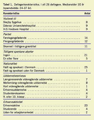 Den kvalitative interviewundersøgelse blev gennemført i sommeren 2005 af en antropolog. Processen fra forberedelse til endelig analyse er sket i tæt dialog med de øvrige medforfattere. Dette møde mellem et klinisk og et antropologisk perspektiv har drevet undersøgelsen frem og hjulpet os til hele tiden at udfordre materialer og konklusioner. De 26 deltagende gravide blev henvist til undersøgelsen af praktiserende læger. De pågældende læger visiterede til henholdsvis Skejby Sygehus, Odense Universitetshospital og Hvidovre Hospital. De tre visitationsområder blev valgt, da de har forskellige informationsstrategier og visitationsmuligheder i forhold til tilbuddet om fosterdiagnostik. De praktiserende læger blev bedt om fortløbende at henvise gravide til projektet ved første lægebesøg. Eneste kriterium var, at kvinderne talte dansk (Tabel 1 ).