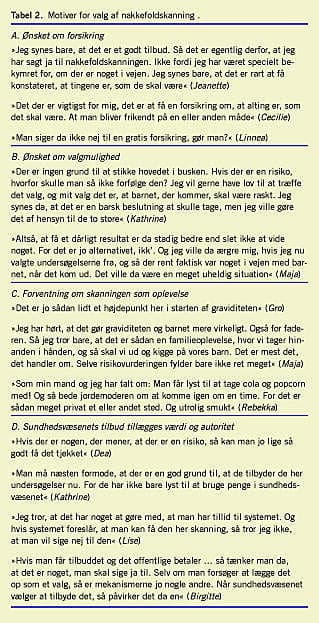 Et afgørende motiv var forsikring (Tabel 2 A). Undersøgelsens gravide var grundlæggende sikre på, at alting var, som det skulle være, men ville alligevel gerne bekræftes, når muligheden var der. Nakkefoldskanningen sås som en risikofri måde at få denne forsikring på. Ikke en garanti for et perfekt barn og en ukompliceret graviditet, men en vished om, at barnet var sundt og normalt på det givne tidspunkt.