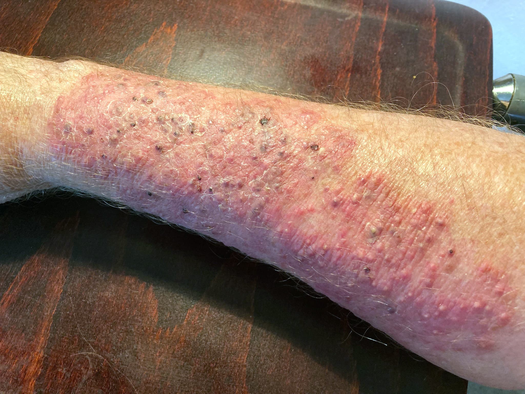 En 71-årig mand med psoriasis vulgaris og psoriasisartritis i biologisk behandling pådrog sig en fraktur af højre overarmsknogle. Efter mislykket konservativ behandling blev der udført osteosyntese, og postoperativt udviklede patienten ødem i underarmen. Efter kort tid sås der psoriasisplaques i det ødematøse område, men ikke i det traumatiserede område, som havde undergået kirurgi. Dette blev betragtet som Köbners fænomen med opblussen af psoriasis i ellers ikke involveret hud.